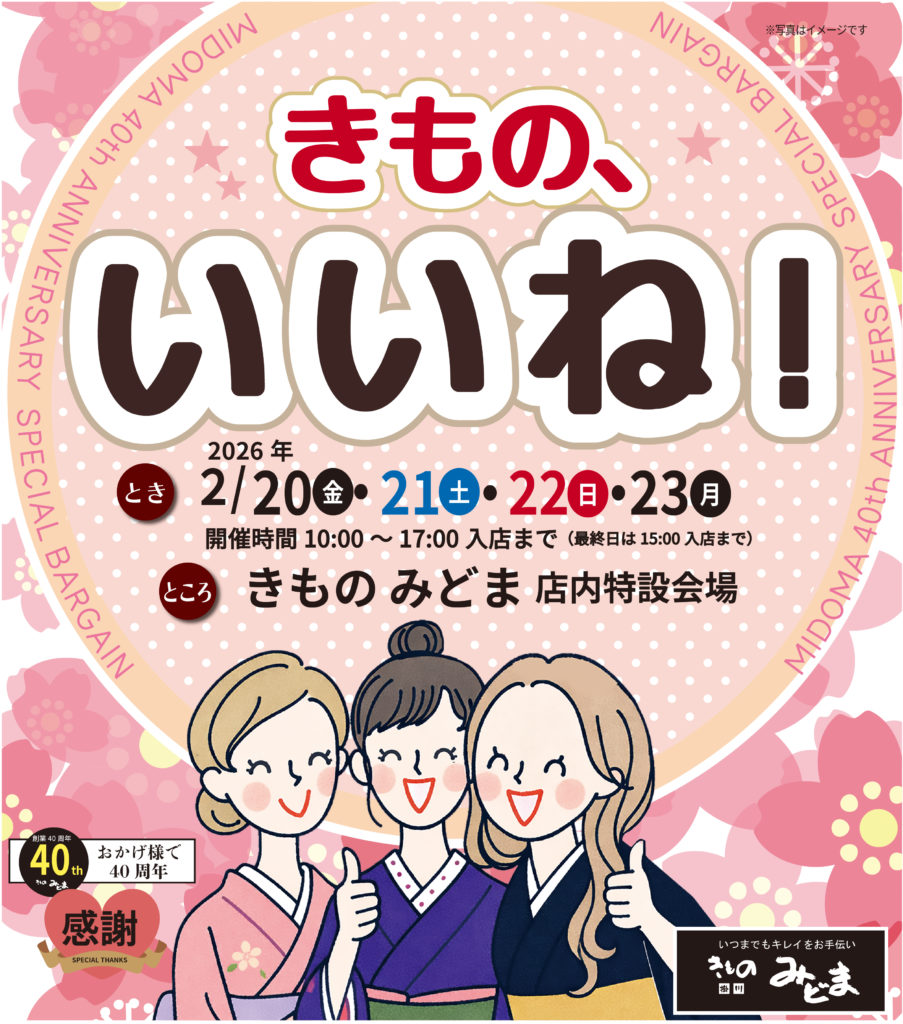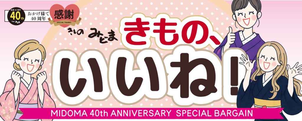 おかげ様で40周年。きもの みどま です。この度、「きもの、いいね!」を合言葉にこのチラシを作りました。ご覧の皆様、きもの着ておられますか?