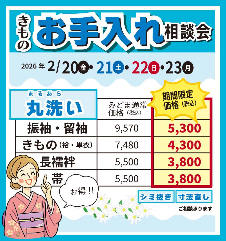 きものを着る方にお得なお知らせ!なんと、この4日間はきもののお手入れがお得にできるんです!!