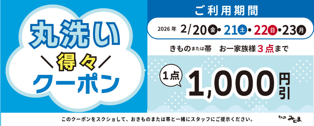 きものまたは帯、お一家族様3点まで、特別価格にて承ります。上のクーポンをスクショしてスタッフにご提示ください。